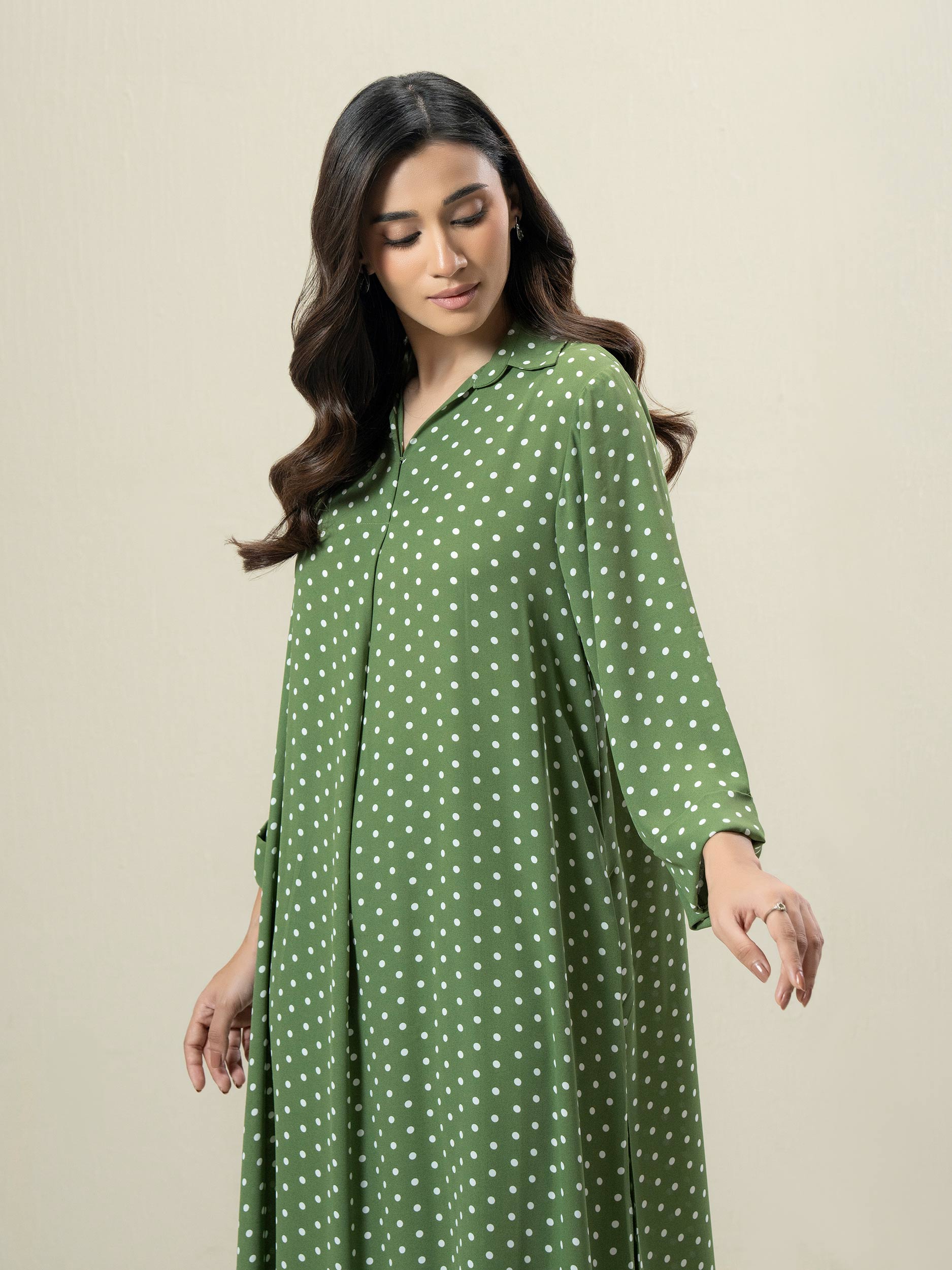- Loose fit polka-dotted shirt with collar neckline