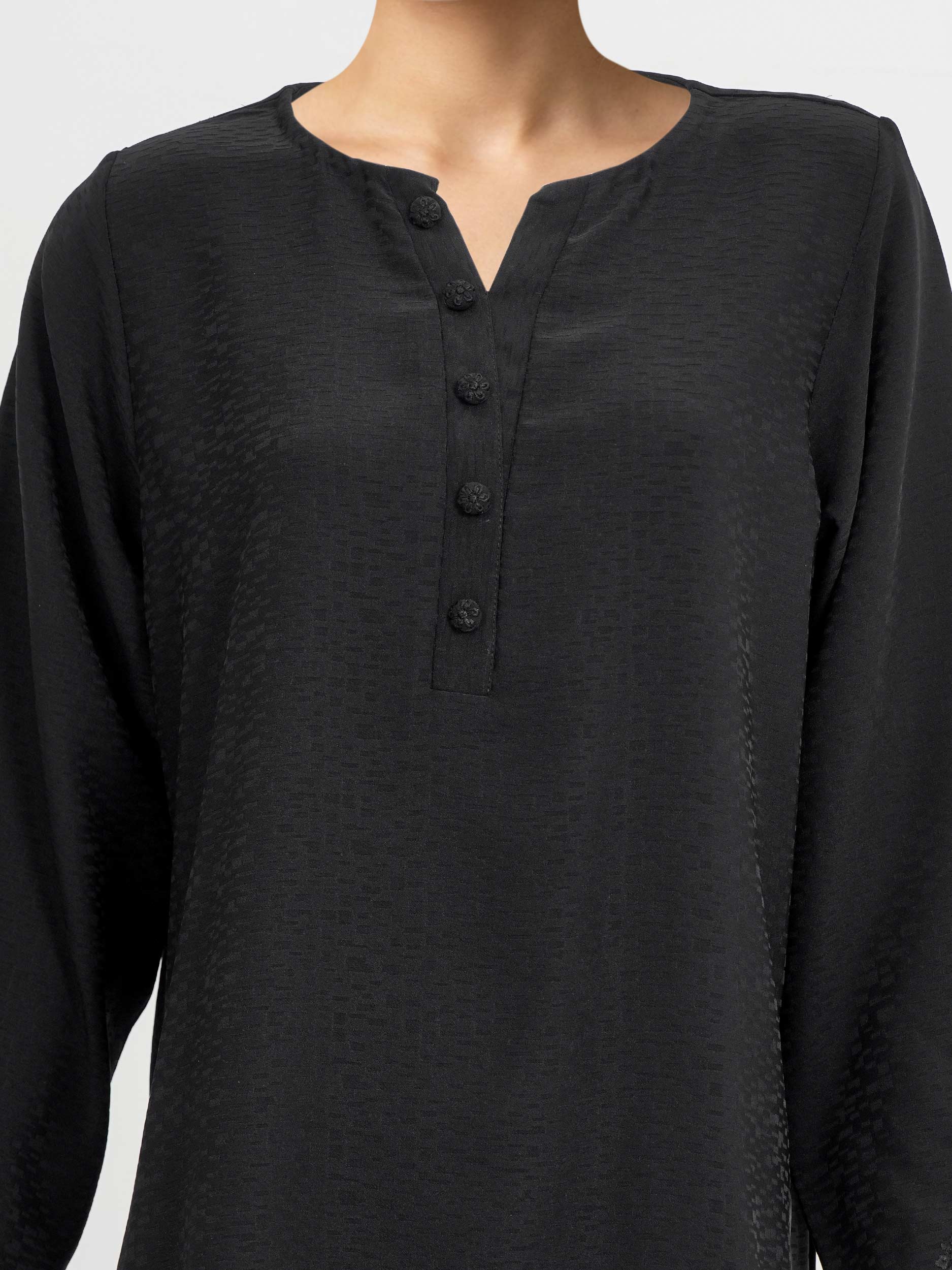 - Solid shirt with scalloped embroidery on shirt hem, sleeve hems, and button detailed