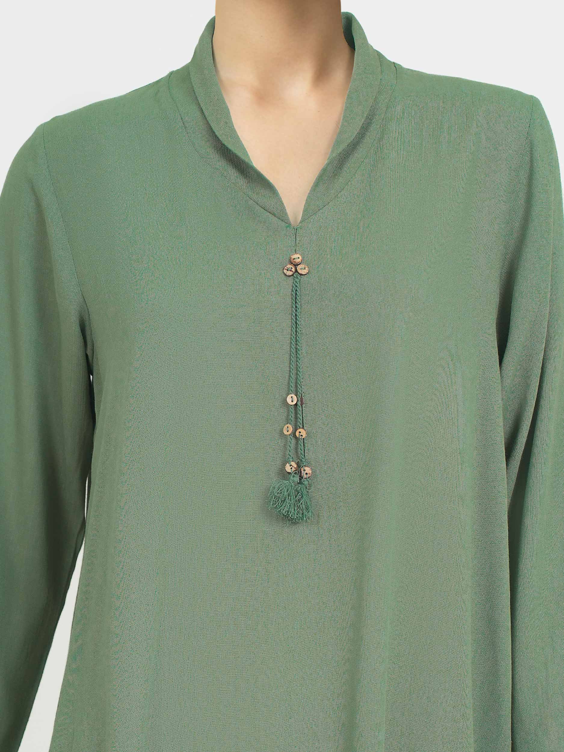 - Straight-cut shirt with a V-neckline and tassel detailing