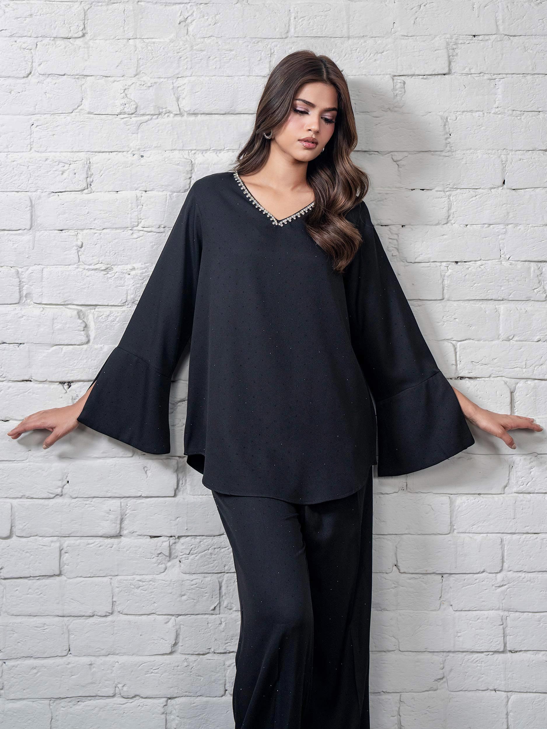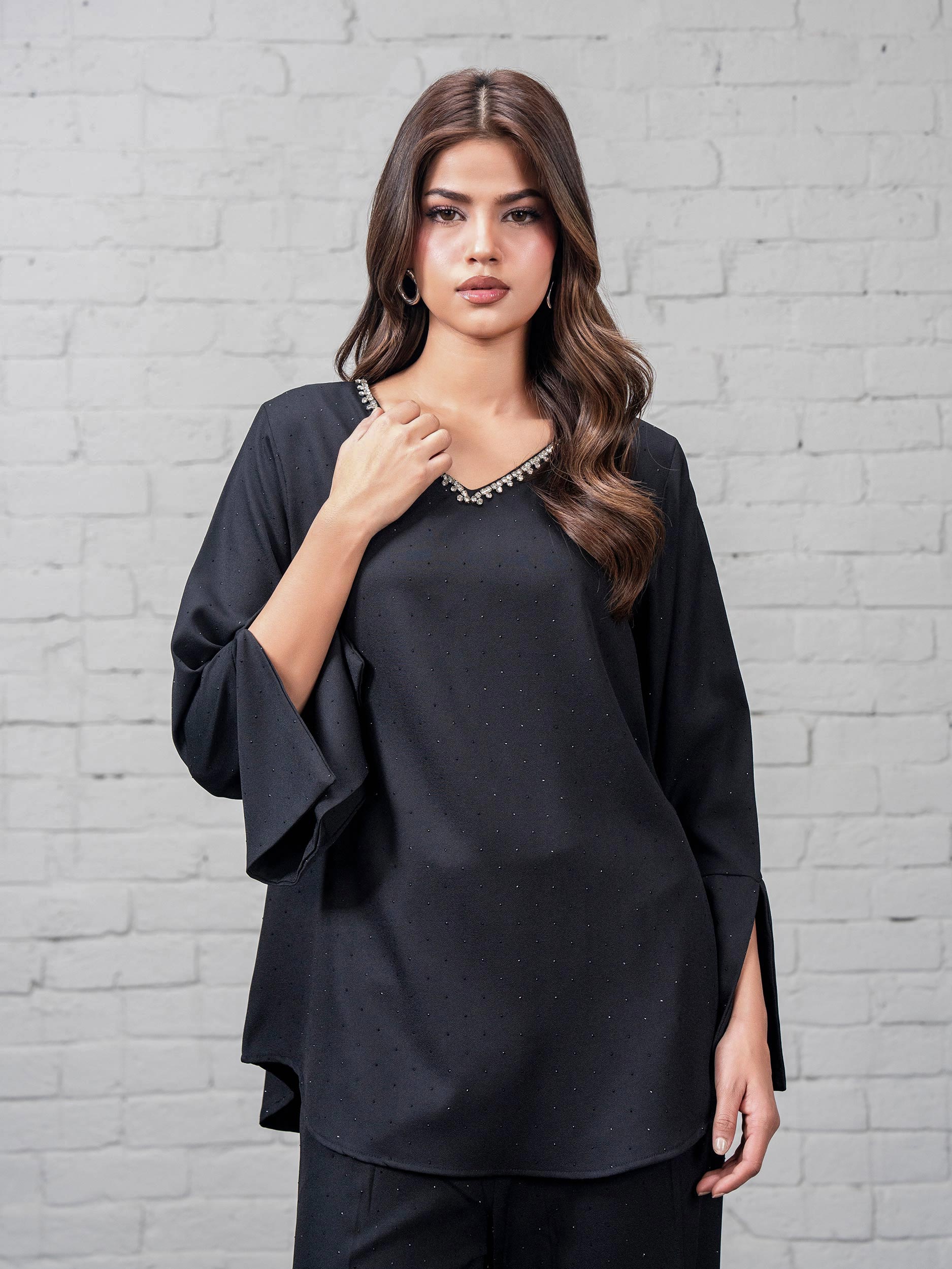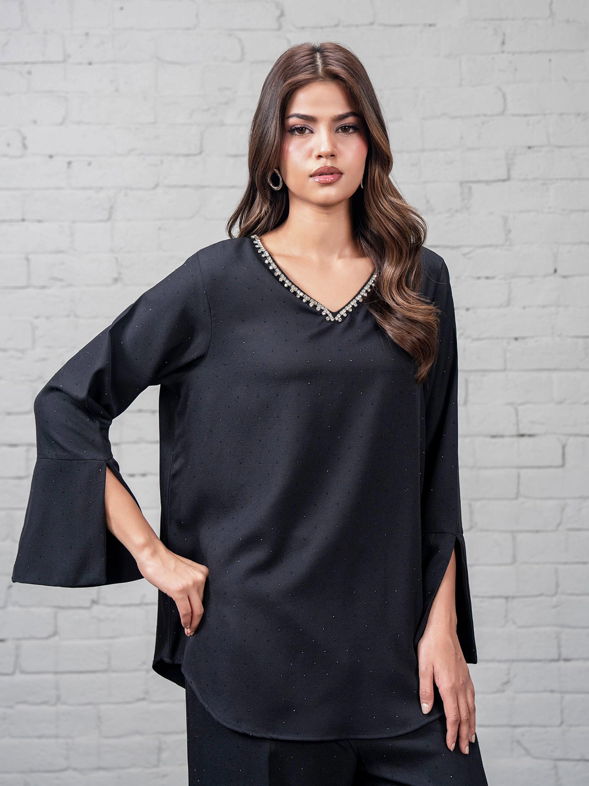 - Embellished top with a rhinestone-embellished V-neckline and flared cuffed sleeves