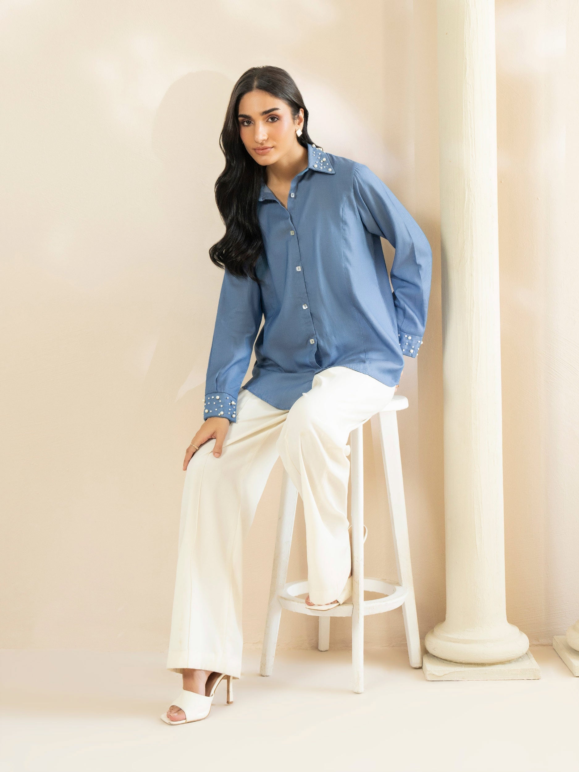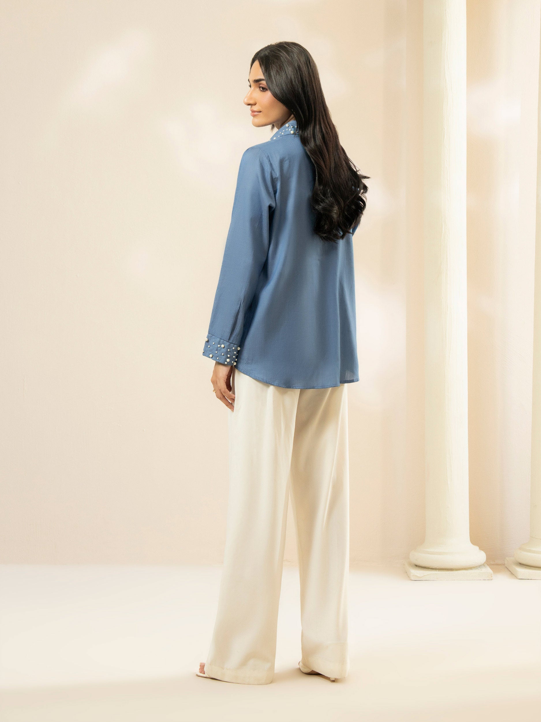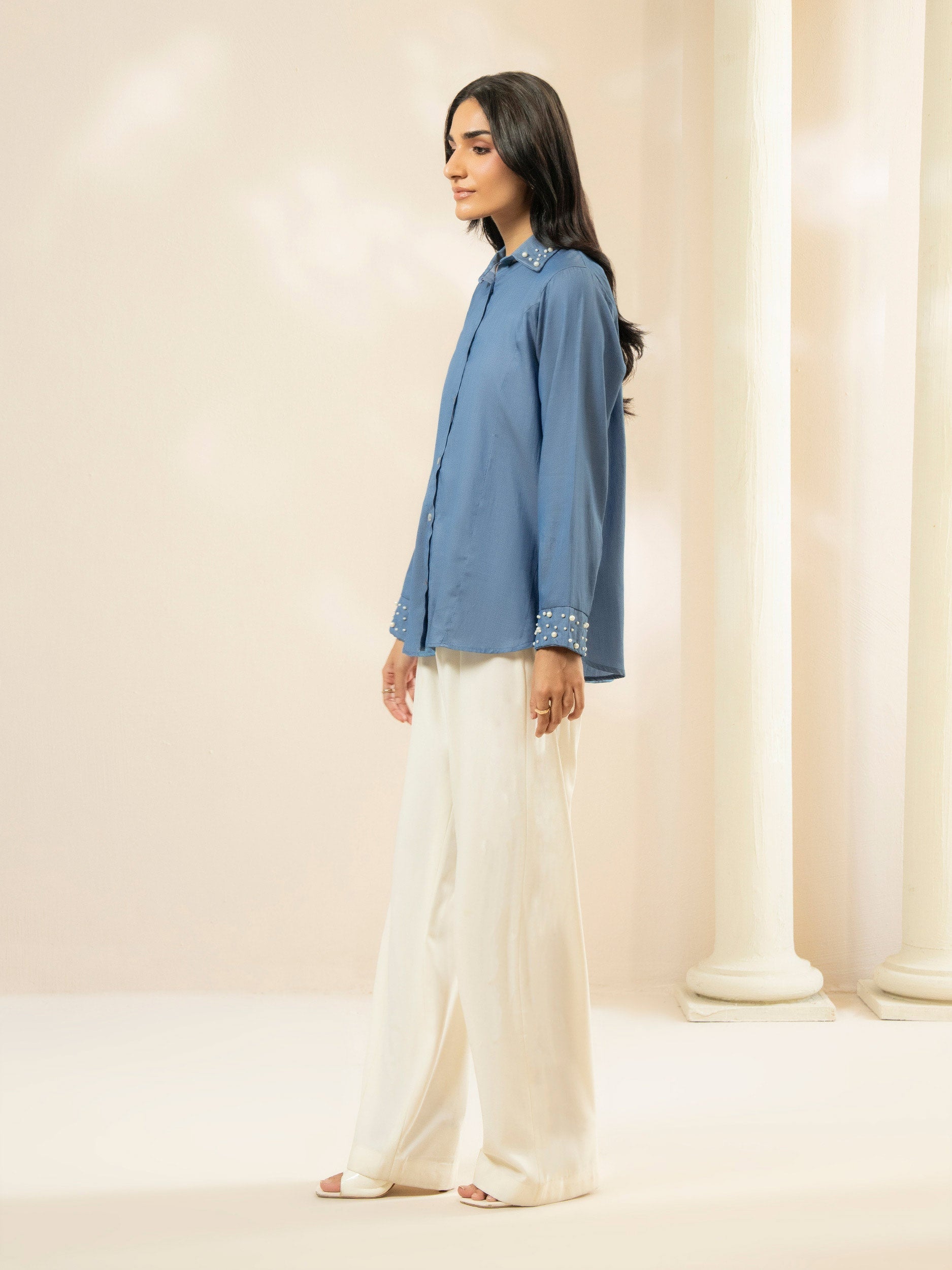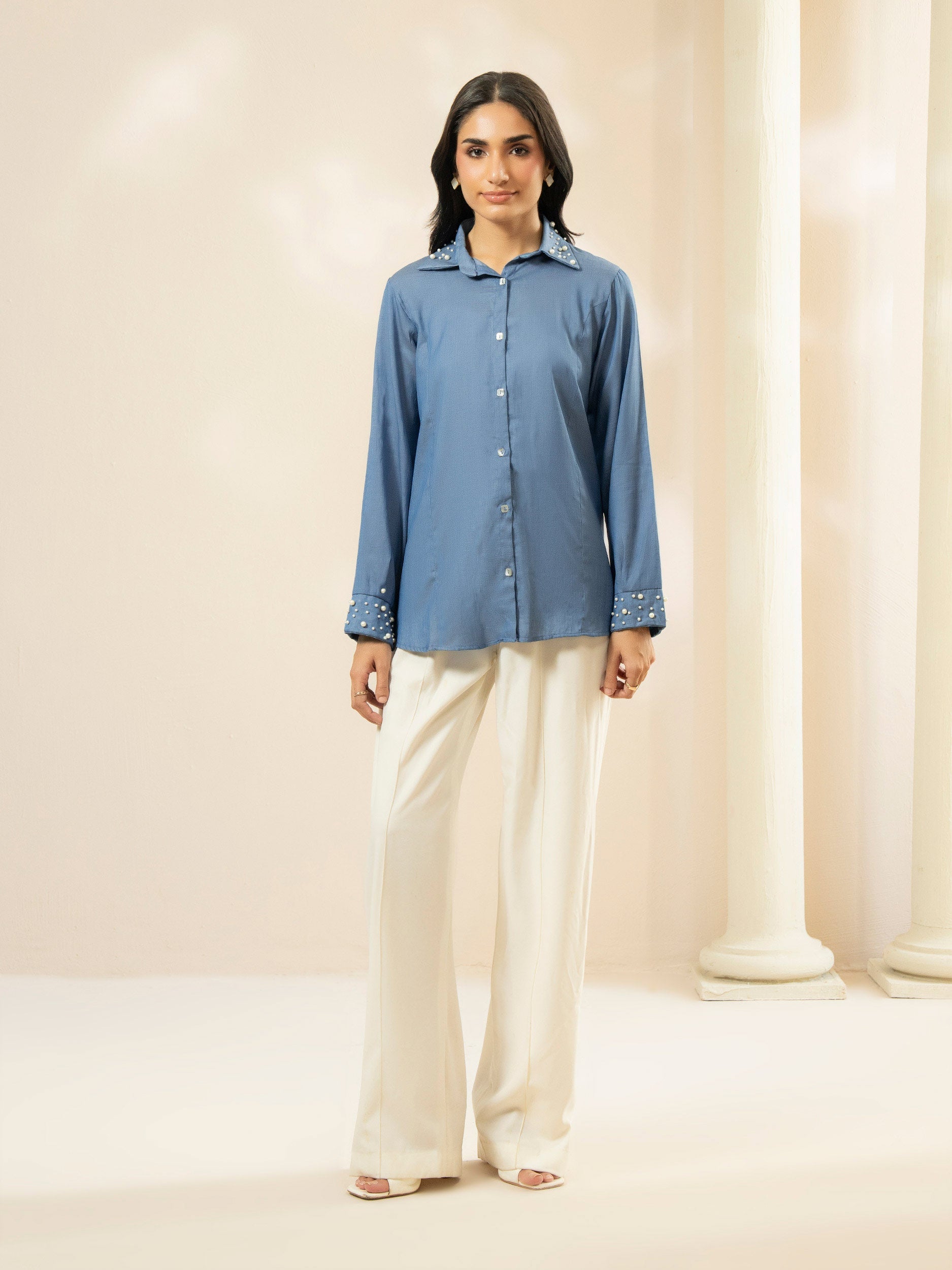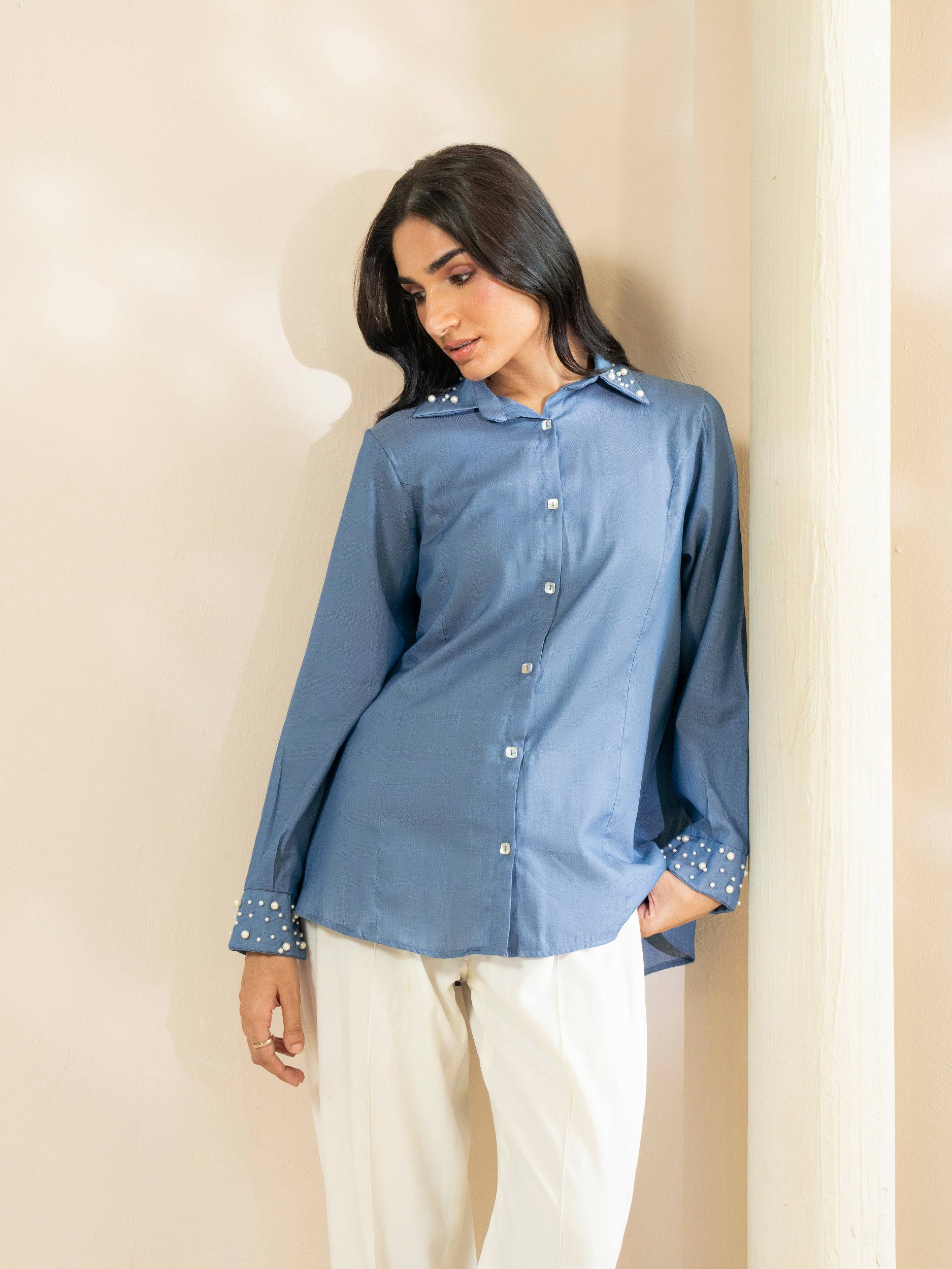 • Button down top with beads detailing on cuff and collar