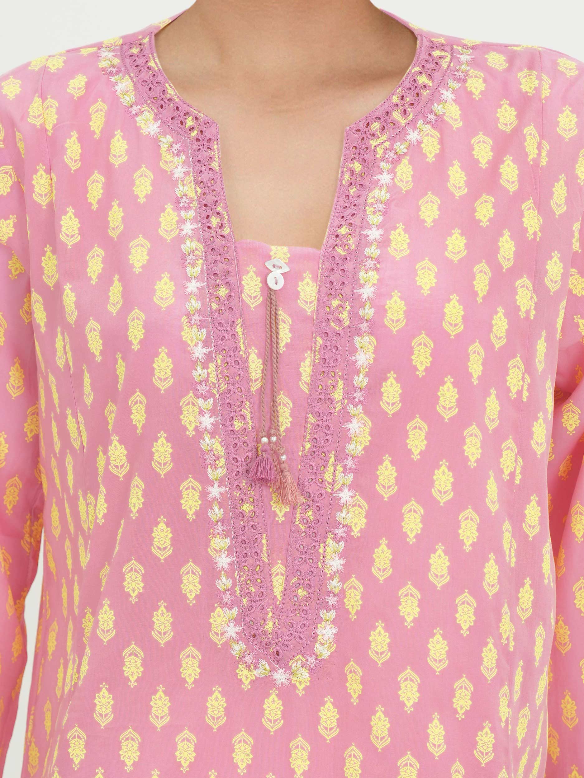 Straight-cut paste printed shirt, with a schiffli embroidered neckline and sleeve hems, and tassel detailing