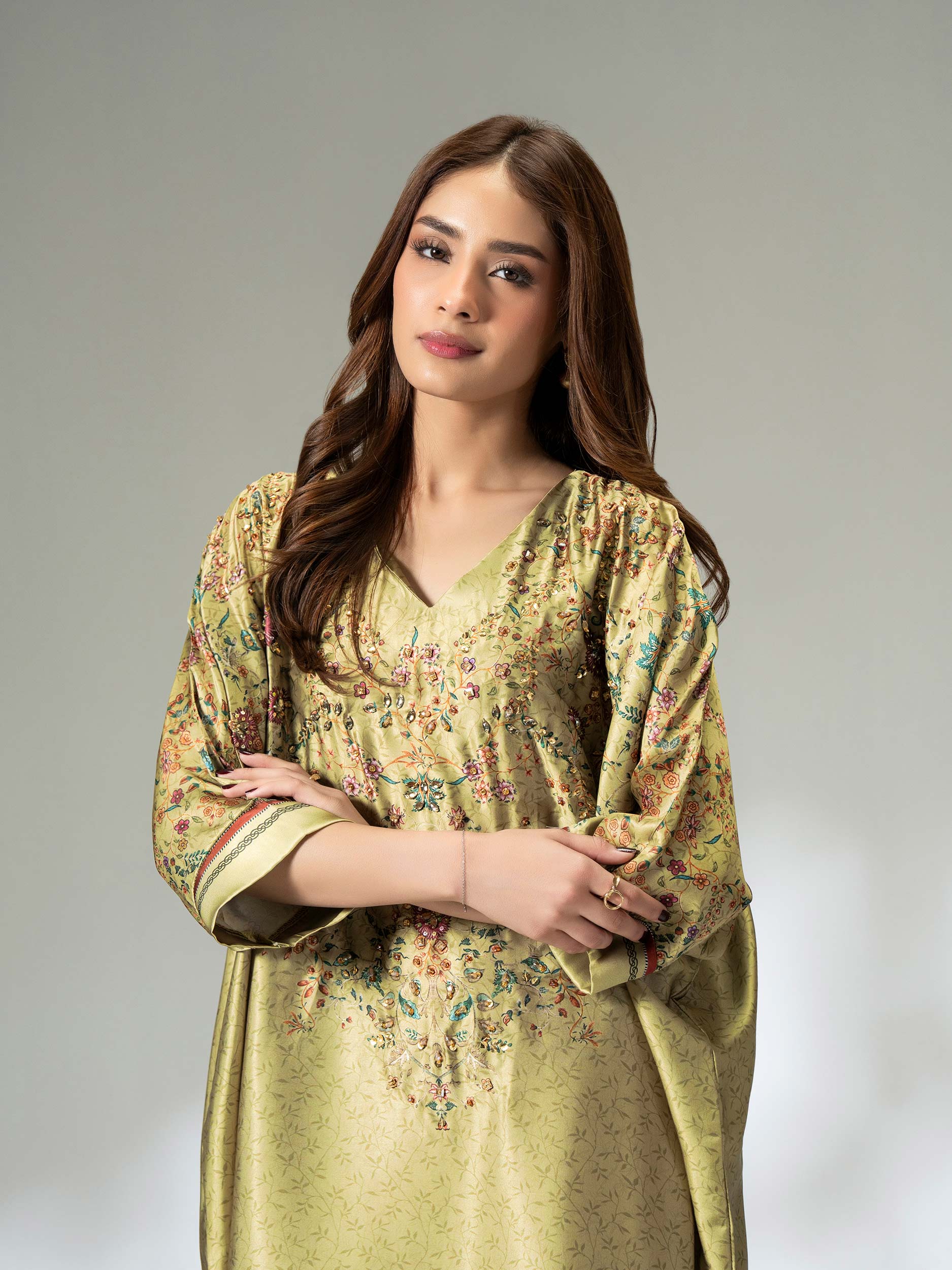 - Embellished printed kaftan with V neckline