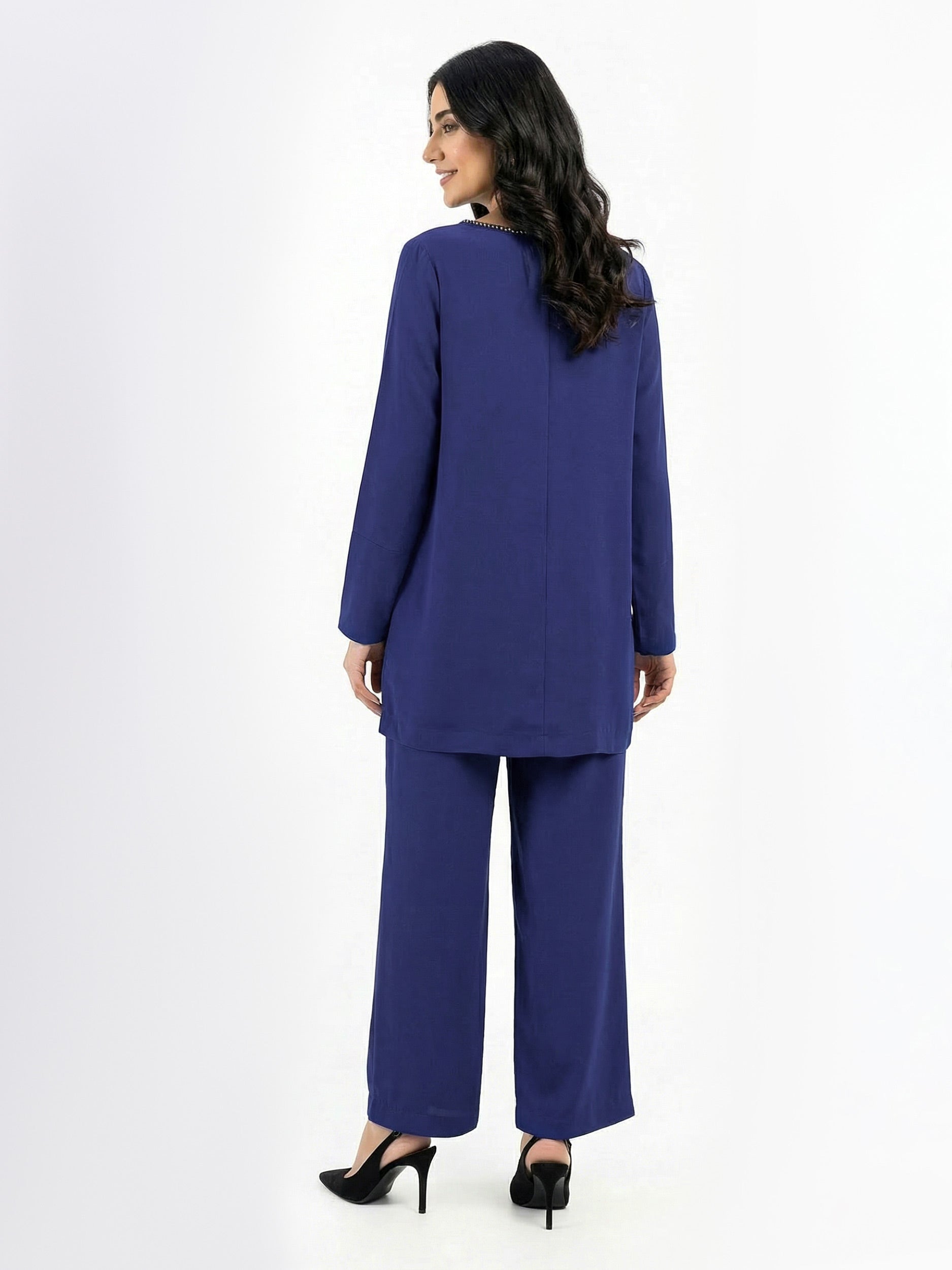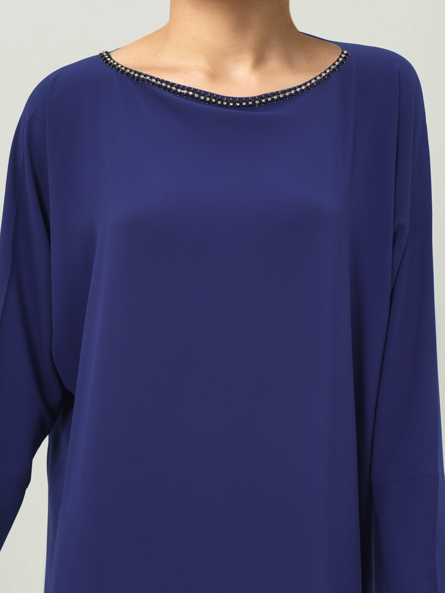 - Flowy kaftan with a stone-embellished neckline and buttoned