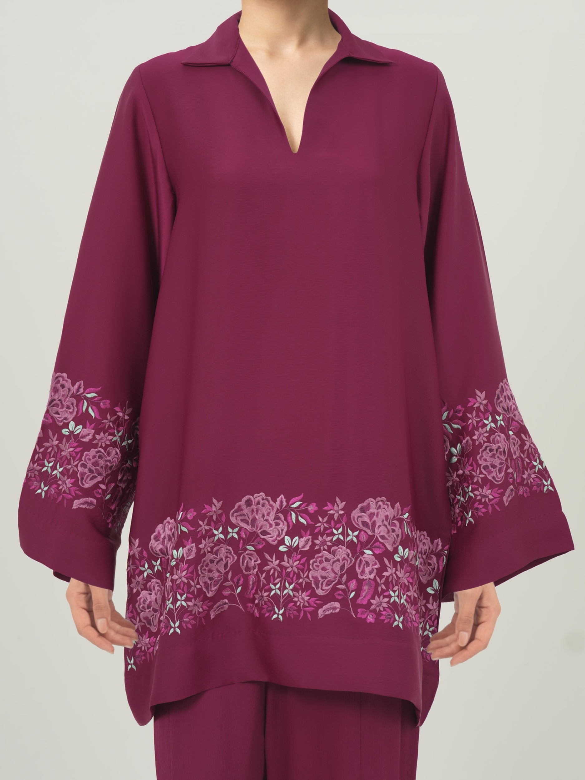 - V-neckline top with floral embroidered hem and sleeves