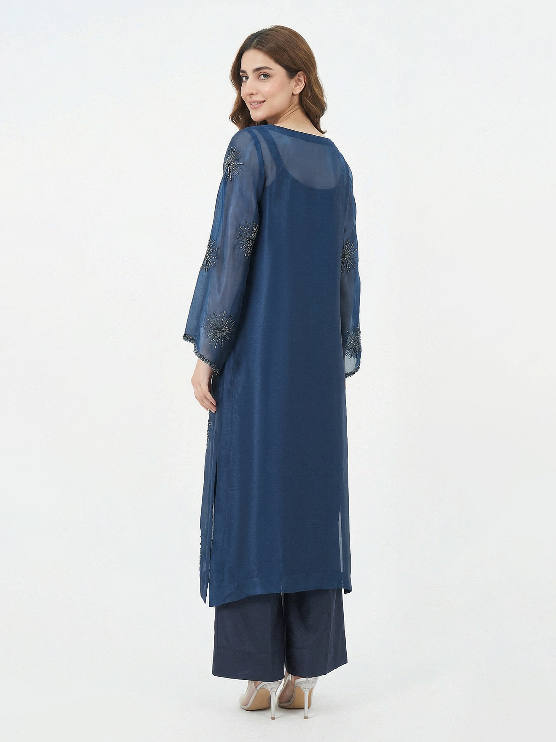 - Long, flowy shirt with cut-dana embroidery, a round neckline, and flowy sleeves with