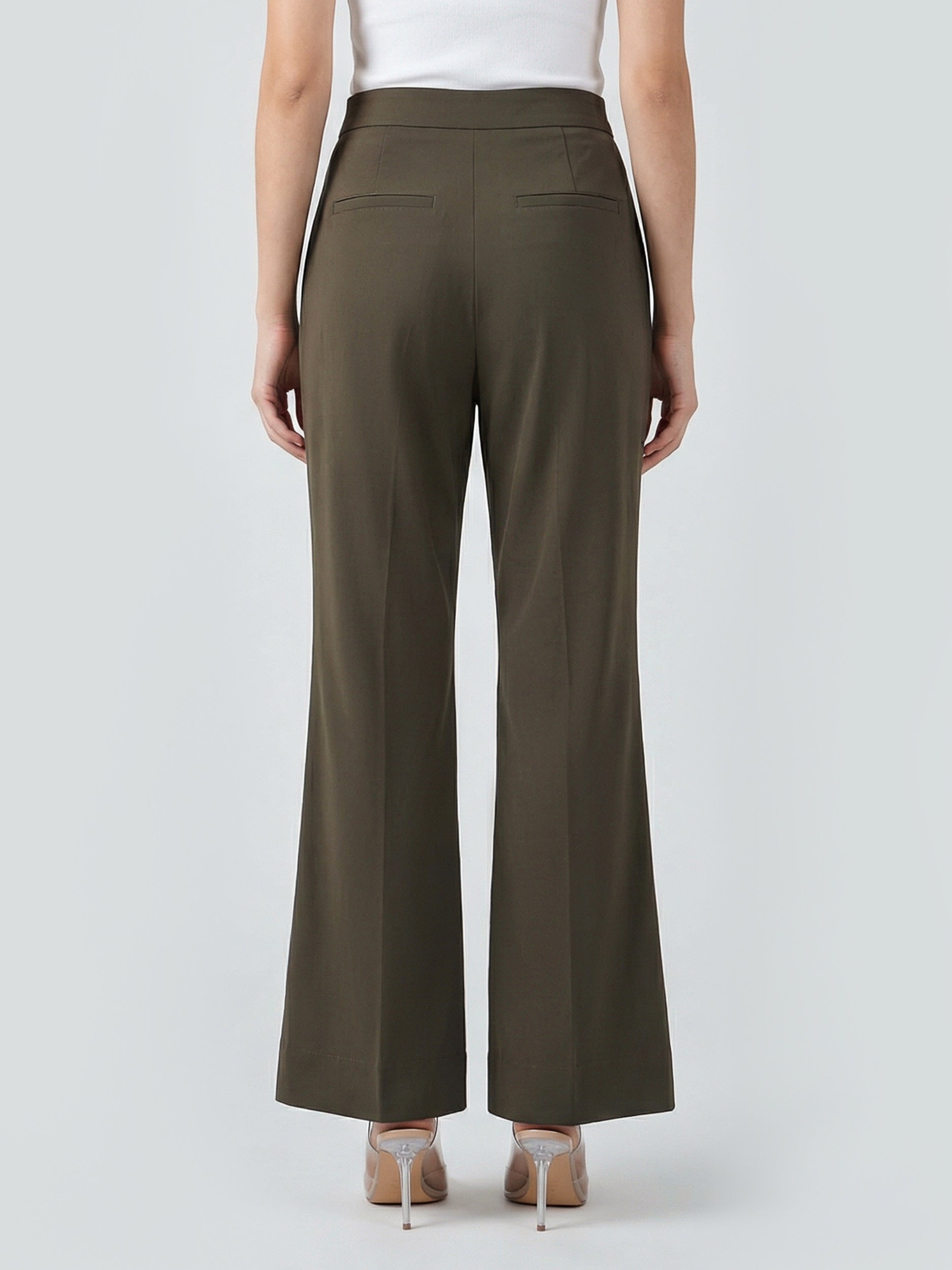 High-waisted wide-leg pants with a front zip closure and side and back pockets.